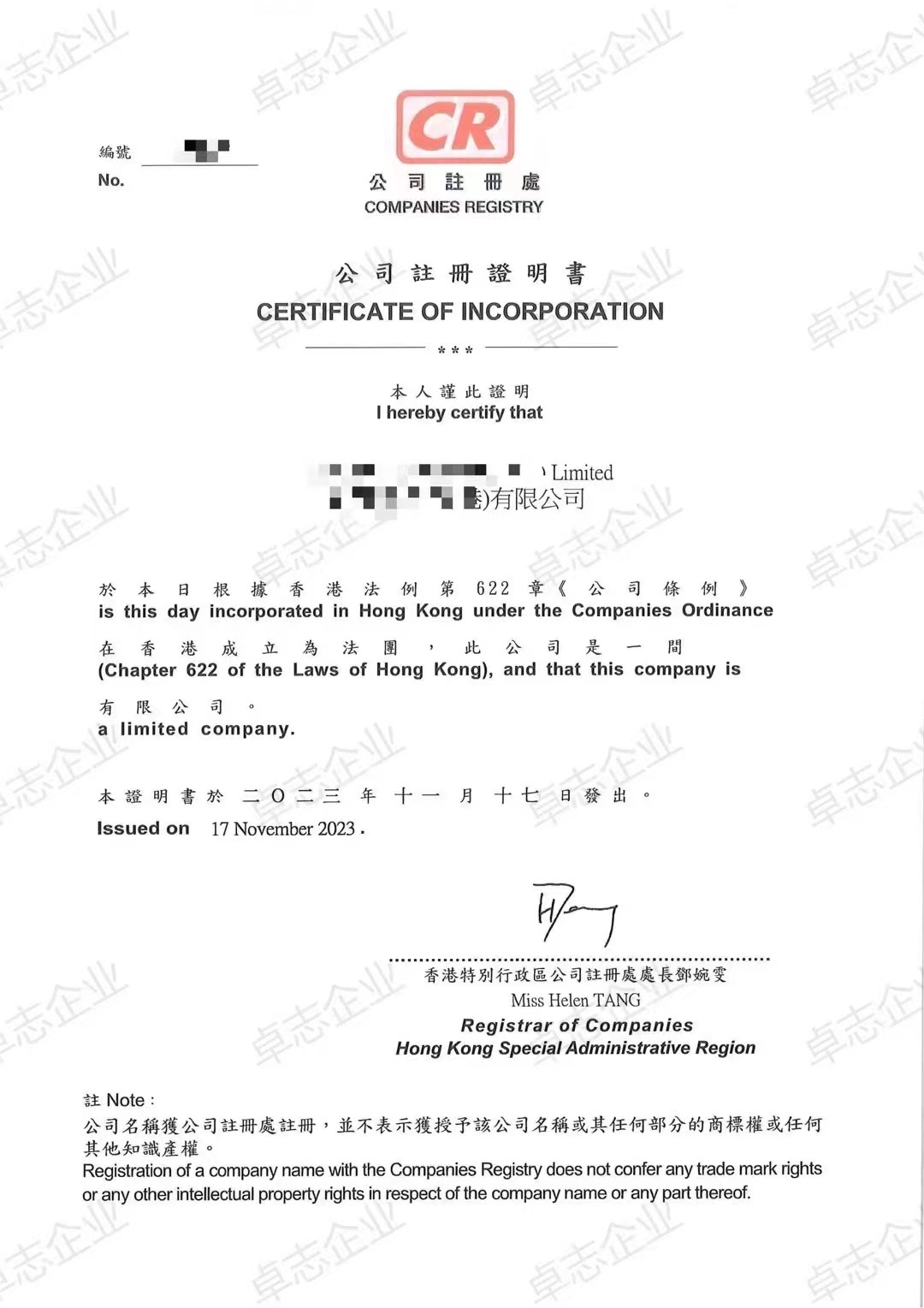 英文名稱必須以“Limited”結尾,中文名稱必須以“有限公司”結尾