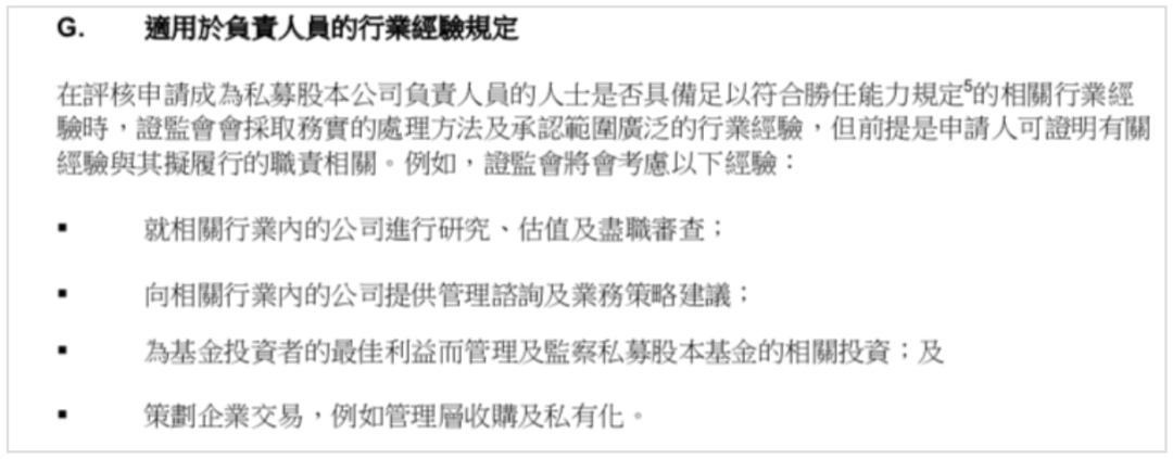 持牌主體不同,LPF運(yùn)營成本差異巨大 對于香港LPF的持牌主體,LPFO并未直接作出規(guī)定,主要由香港證監(jiān)會的《證券及期貨條例》及相關(guān)法例予以規(guī)管。 根據(jù)《證券及期貨條例》,香港證監(jiān)會依據(jù)“實質(zhì)大于形式”的原則,來判斷實際從事LPF投資管理的主體,而不僅僅是GP、投資經(jīng)理或管理人,甚至投資委員會等“名稱”。 在判斷哪一主體是實際從事LPF投資管理事宜時,證監(jiān)會主要關(guān)注其是否對LPF的投資享有決策權(quán)。從這個角度看,香港LPF的持牌主體主要可以是: 1. 普通合伙人(GP)——如果LPF由GP進(jìn)行管理,則GP需要取得牌照,成為持牌法團(tuán)。 鑒于投資決策委員會并非必須,因此,下面我們主要來看看在不同情況下GP和投資經(jīng)理持牌的運(yùn)營成本(如下表)。 以申請9號牌為例,無論是時間成本還是財務(wù)成本都非常高。 首先,機(jī)構(gòu)主體在申請牌照前的6年最少具備3年相關(guān)行業(yè)經(jīng)驗,至少委任2名符合條件的投資負(fù)責(zé)人(Responsible Officers,“RO”),其中1名須在香港辦公。此外,至少1名RO是符合香港證監(jiān)會要求的執(zhí)行董事,并需要提前向證監(jiān)會尋求核準(zhǔn)資格。 而且,成為RO也是有一定準(zhǔn)入門檻的,必須通過香港監(jiān)管科目考試,并且在三年相關(guān)工作經(jīng)驗加兩年管理經(jīng)驗后,才具備申請成為RO的資格;而執(zhí)行董事的要求則更高。 《私募通函》對RO行業(yè)經(jīng)驗的要求如下,供參考: