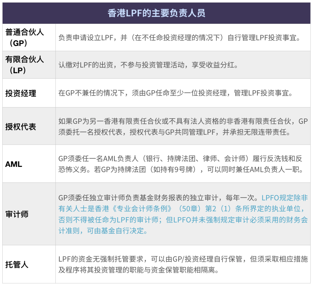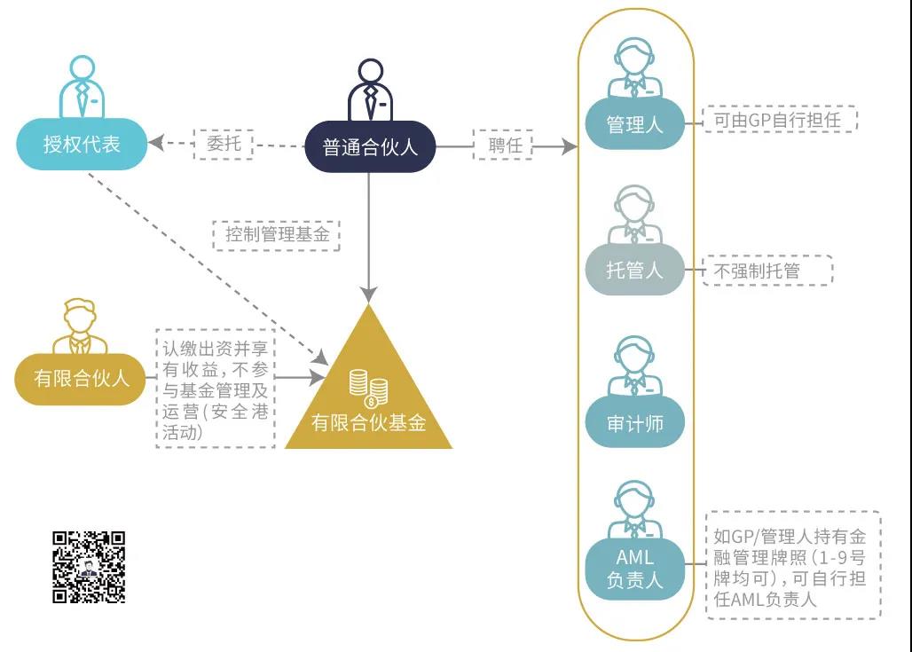 1、向開曼看齊:香港LPF的基本架構(gòu) 根據(jù)香港LPFO,LPF的定義與開曼群島、新加坡采用有限合伙制的私募基金含義基本一致。在一個典型的香港LPF中,其運(yùn)營至少需要涉及到普通合伙人(GP)、有限合伙人(LP)、投資經(jīng)理、授權(quán)代表、AML【1】、審計師、托管人等重要負(fù)責(zé)人員,基本要求如下表所示: *【1】AML是反洗錢(Anti Money Laundering)的簡稱,指為了預(yù)防通過各種方式掩飾、隱瞞毒品犯罪、黑社會性質(zhì)的組織犯罪、恐怖活動犯罪、走私犯罪、貪污受賄犯罪、破壞金融市場秩序犯罪等犯罪所得及其收益的來源和性質(zhì)的洗錢活動。在證券和私募基金等金融市場中,AML負(fù)責(zé)人員往往是必不可少的合規(guī)風(fēng)控要求,香港LPF也不例外。* 基于上述主要負(fù)責(zé)人員,我們大致可以勾勒出一個香港LPF的基本架構(gòu): 過去的一個多月中,我們接到了很多對香港有限合伙基金(Limited Partnerhisp Fund, “LPF”)感興趣的客戶咨詢,所涉問題很多,包括但不限于: