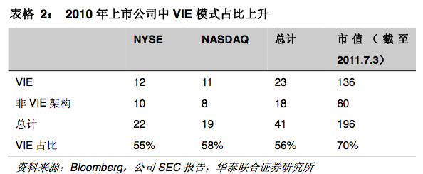 近期數(shù)據(jù)表明, VIE 架構(gòu)的使用有逐步加強(qiáng)的趨勢。2010 年 22 家主板上市企業(yè)中12 家使用 VIE 架構(gòu),19 家納斯達(dá)克上市企業(yè)中 11 家使用 VIE 架構(gòu),其中包括當(dāng)當(dāng)、博納影業(yè)、優(yōu)酷、麥考林等知名企業(yè),占比高達(dá) 55%和 58%。從市值角度看,VIE架構(gòu)企業(yè)更勝一籌,以 2011 年 7 月 3 日收盤價計,實(shí)行 VIE 架構(gòu)的企業(yè)總市值占比達(dá) 70%(表 2、表 3)。