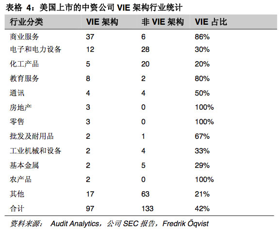 上市公司所處的行業(yè)看,使用 VIE 架構(gòu)最多的是在國家對外商投資有嚴(yán)格限制的領(lǐng)域,從最早的互聯(lián)網(wǎng)復(fù)制到后來的教育、金融服務(wù)和房地產(chǎn)。在上市文件中,大多數(shù)公司將國家對外商投資特定領(lǐng)域 的限制列為公司使用 VIE 結(jié)構(gòu)的主要原因,其次是政府對企業(yè)赴海外上市的規(guī)定。這些數(shù)據(jù)驗(yàn)證了我們之前的判斷,VIE 已經(jīng)成為中國企業(yè)規(guī)避海外上市限制的主要手段。