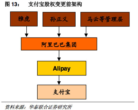在協(xié)議控制結(jié)構(gòu)下,支付寶從阿里巴巴集團(tuán)旗下全資子公司 Alipay,轉(zhuǎn)至馬云和謝世煌全資擁有的浙江阿里巴巴電子商務(wù)有限公司(下稱浙江阿里巴巴)。工商資料顯示,轉(zhuǎn)讓分兩次進(jìn)行,一次在 2009 年 6 月 1 日,另一次發(fā)生在 2010 年 8 月 6 日,兩次轉(zhuǎn)讓的總價約為 3.3 億元。矛盾發(fā)生在股權(quán)轉(zhuǎn)讓之后。2011 年一季度,馬云以協(xié)議控制不能獲取第三方支付牌照及危害國家經(jīng)濟(jì)安全為由,在股東反對、董事會未通過的情況下,單方面決定斷掉支付寶與阿里巴巴集團(tuán)之間的 協(xié)議控制關(guān)系(圖 13、圖 14)。