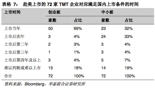事實(shí)上,我們選取的 72 家赴美上市的 TMT 企業(yè),從其歷年盈利變化情況來看,超過八成企業(yè)滿足國內(nèi)創(chuàng)業(yè)板和中小板的盈利要求,只是上市的時間有所延后(表 7)。統(tǒng)計數(shù)據(jù)顯示:有 50 家企業(yè)赴美上市當(dāng)年就滿足創(chuàng)業(yè)板的條件,23 家滿足中小板的條件,占比分別為 69%和 32%;上市后次年滿足創(chuàng)業(yè)板和中小板的家屬分別為 3 家和24 家,占比 4%和 33%;兩項(xiàng)合計分別占比 73%和 65%??梢?逾六成企業(yè)在赴美上市與國內(nèi)上市之間的時間差異并不大。當(dāng)然,有人會認(rèn)為赴美上市后企業(yè)的利潤增長得益于資金助推,但我們的觀點(diǎn)是,利潤增 長更多的動力是來自整個 TMT 領(lǐng)域從無到有、從小到大的行業(yè)性機(jī)會。
