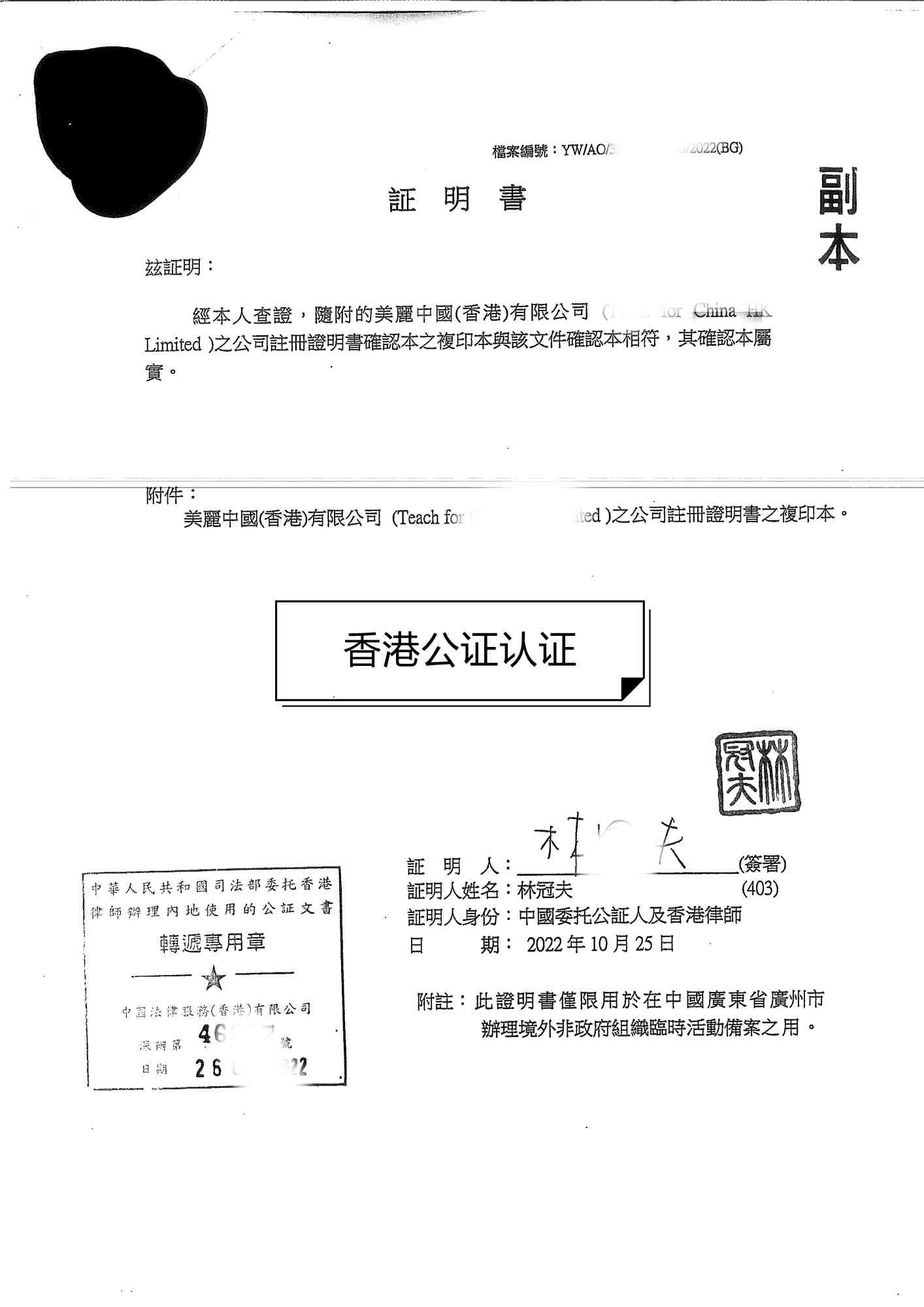 香港公司文件公證認(rèn)證用于國(guó)內(nèi)成立外資公司只需要2步程序: