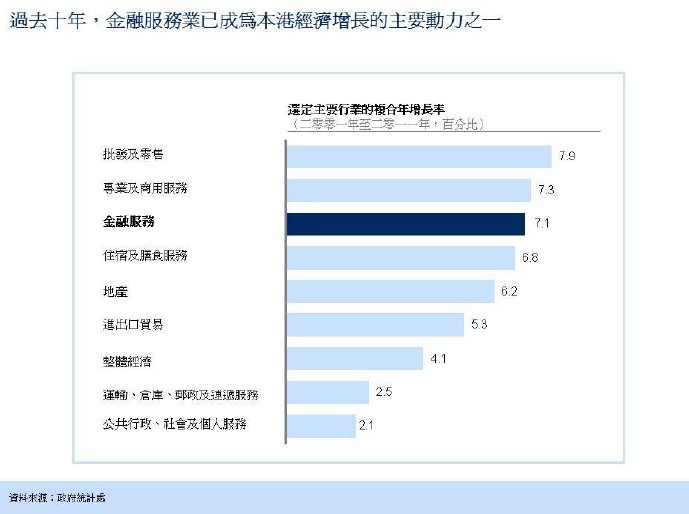 經(jīng)濟(jì)周期中推動(dòng)經(jīng)濟(jì)增長(zhǎng)的主要?jiǎng)恿?/strong> - 二零零一年至二零一一年間,金融服務(wù)業(yè)是推動(dòng)香港經(jīng)濟(jì)增長(zhǎng)的主要催化劑及動(dòng)力。按名義價(jià)值計(jì)算,金融服務(wù)業(yè)的復(fù)合年增長(zhǎng)率為7.1%,而整體經(jīng)濟(jì)復(fù)合年增長(zhǎng)率只有4.1%。特別是二零零八年至二零零九年爆發(fā)全球金融危機(jī)后經(jīng)濟(jì)復(fù)蘇,金融服務(wù)業(yè)展現(xiàn)頑強(qiáng)的抗逆能力,率先迅速反彈,更在二零零九年至二零一一年間錄得復(fù)合年增長(zhǎng)率9.5%。