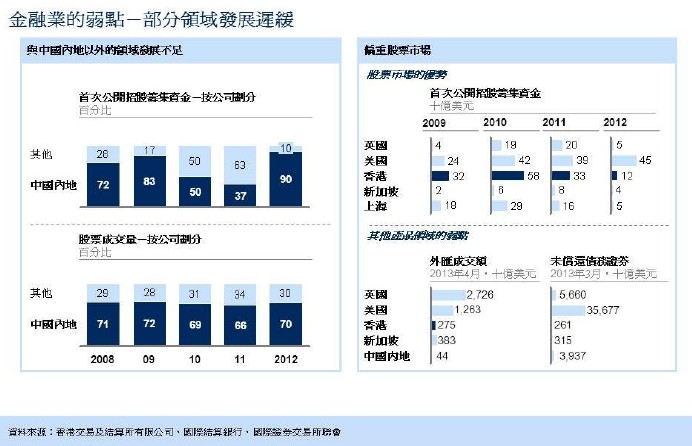 (e) 金融服務(wù)業(yè)需要更多元化 - 香港股票市場(chǎng)的競(jìng)爭(zhēng)力有目共睹,二零零九年至二零一一年間,香港交易所的首次公開(kāi)招股集資額連續(xù)三年居全球榜首,且過(guò)去十年每年都位列前五名。然而,香港偏重股票市場(chǎng),導(dǎo)致債券、外匯及商品業(yè)務(wù)發(fā)展相對(duì)遲緩。香港偏重單一市場(chǎng),意味著金融業(yè)的整體抗逆能力較弱,在股票市場(chǎng)不振之時(shí)尤為明顯。過(guò)去十年間,內(nèi)地是香港金融服務(wù)業(yè)增長(zhǎng)的主要?jiǎng)恿?,特別是在股票市場(chǎng)方面,過(guò)去五年間,內(nèi)地公司占首次公開(kāi)招股集資額的59%,每日股票成交量更達(dá)七成。內(nèi)地市場(chǎng)的主導(dǎo)地位,令香港較忽略投入資源發(fā)展亞洲其他高潛力市場(chǎng),亦未有如競(jìng)爭(zhēng)對(duì)手般把握市場(chǎng)份額。在贊揚(yáng)股票市場(chǎng)及協(xié)助中國(guó)企業(yè)集資方面取得成就的同時(shí),香港需要營(yíng)造更多元化及更具韌力的金融服務(wù)業(yè),以鞏固作為真正多元化國(guó)際金融重鎮(zhèn)的地位。