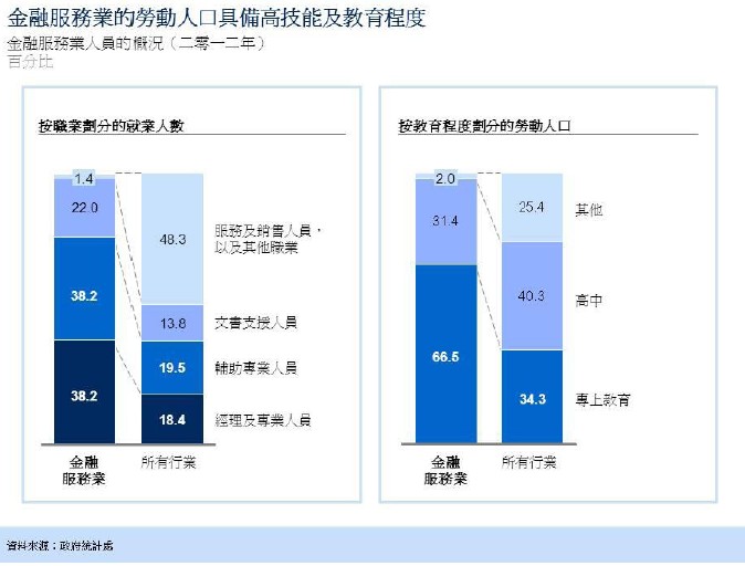 - 從業(yè)員具備熟練技能及較高資歷。高技術(shù)人員方面,二零一二年,經(jīng)理和專業(yè)人員占金融服務(wù)業(yè)雇員總數(shù)一大部分,達(dá)38.2%,較所有行業(yè)的平均數(shù)18.4%高出一倍有多。至于教育程度方面,具專上教育程度雇員所占的比例亦達(dá)66.5%,而所有行業(yè)只有34.3%,顯示金融服務(wù)業(yè)正帶動(dòng)香港轉(zhuǎn)型至知識(shí)型經(jīng)濟(jì)。