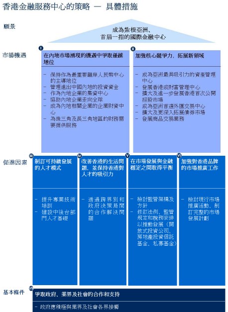 (I) 在內(nèi)地市場(chǎng)涌現(xiàn)的機(jī)遇中爭(zhēng)取優(yōu)越地位,成為投資資金進(jìn)出中國(guó)市場(chǎng)的首選中心,包括協(xié)助內(nèi)地企業(yè)進(jìn)行國(guó)際集資、協(xié)助內(nèi)地企業(yè)走向全球、成為內(nèi)地企業(yè)設(shè)立海外總部的首選地點(diǎn)、成為首選離岸人民幣中心,并服務(wù)珠三角數(shù)以億計(jì)人口的財(cái)務(wù)需要。為求擴(kuò)大以上業(yè)務(wù)的市場(chǎng)份額,香港應(yīng)尋求在內(nèi)地金融服務(wù)業(yè)的發(fā)展中發(fā)揮積極作用,特別是資本賬項(xiàng)的開(kāi)放、人民幣國(guó)際化及增設(shè)企業(yè)融資管道等主要領(lǐng)域。