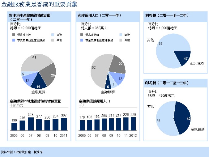 5. 金融服務(wù)業(yè)對(duì)香港本地生產(chǎn)總值的直接貢獻(xiàn)在二零一一年高達(dá)3,000億港元,占本地生產(chǎn)總值的16%,是香港經(jīng)濟(jì)第二大支柱行業(yè)。過(guò)去十年,金融服務(wù)業(yè)的復(fù)合年增長(zhǎng)率達(dá)7%,較整體經(jīng)濟(jì)增長(zhǎng)率高出近一倍,是推動(dòng)香港經(jīng)濟(jì)增長(zhǎng)的主要?jiǎng)恿?。金融服?wù)業(yè)也是政府稅收的主要來(lái)源,于二零一一至一二年的利得稅及印花稅貢獻(xiàn)超過(guò)400 億港元,同時(shí)亦為香港創(chuàng)造不少優(yōu)質(zhì)職位,除直接雇用超過(guò)22.8 萬(wàn)人之余,更間接為如法律、會(huì)計(jì)、運(yùn)輸和地產(chǎn)等相關(guān)行業(yè)創(chuàng)造大量就業(yè)機(jī)會(huì)。金融服務(wù)業(yè)對(duì)其他行業(yè)的帶動(dòng)效應(yīng),例如物業(yè)及專業(yè)服務(wù),以及運(yùn)輸、旅游及通訊等行業(yè)的需求,于二零一一年估計(jì)約達(dá)1,100 億港元。