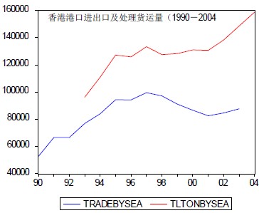 從下圖a可以發(fā)現(xiàn),自2001年開始,以廣州港和深圳港為主體的廣東沿海港口所處理的貨柜吞吐量(GDTEU)呈直線上升趨勢,增長速度快于香港港口的貨柜吞吐量(TOTLTEU)。對于港口貨運處理量(圖b),1998年始,以廣州港和深圳港為主體的廣東沿海港口處理的貨運量(GDTON)的增長速度就快于香港港口,到2000年已超過香港港口貨運處理量(TLTON)。因此,可以得出結論,自2001年始,經(jīng)香港港口轉運逐漸向內地港口直接付運發(fā)展。