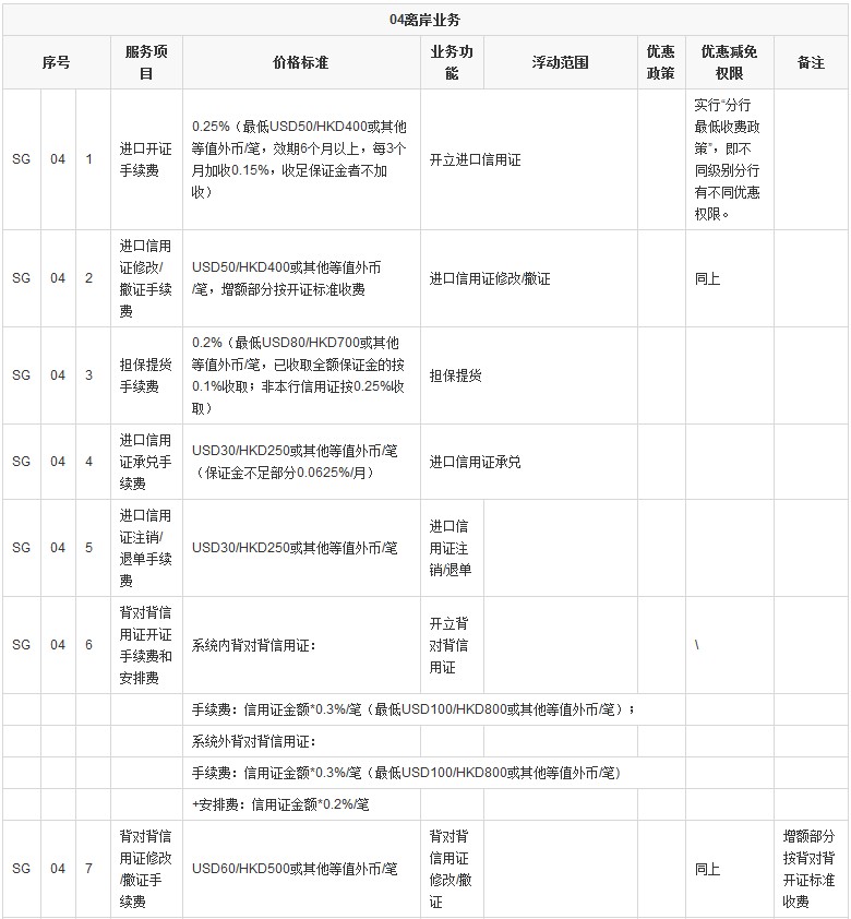 - 進(jìn)口信用證修改/撤證:USD50/HKD400或其他等值外幣/筆,增額部分按開(kāi)證標(biāo)準(zhǔn)收費(fèi)。