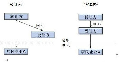 該情形下,非居民轉(zhuǎn)讓方將其直接持有的居民企業(yè)A的股權(quán)轉(zhuǎn)讓給其100%控股的境內(nèi)受讓方(居民企業(yè)),并換取境內(nèi)受讓方的股權(quán),即用原持有的居民企業(yè)股權(quán)增資境內(nèi)受讓方,并使得該境內(nèi)受讓方成為居民企業(yè)A的股東。