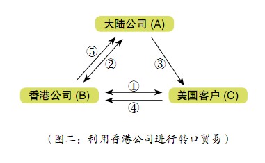 以香港公司為例(參見圖一、二),介紹如何通過離岸公司轉(zhuǎn)口貿(mào)易操作達(dá)到避稅的目的。