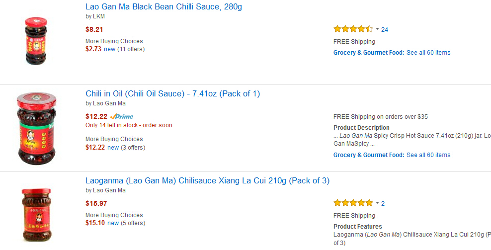 特意上美亞看下,還真是,不過(guò)也有8美金左右的。給好評(píng)五星量嚇到了,老干媽真是大眾口味啊。