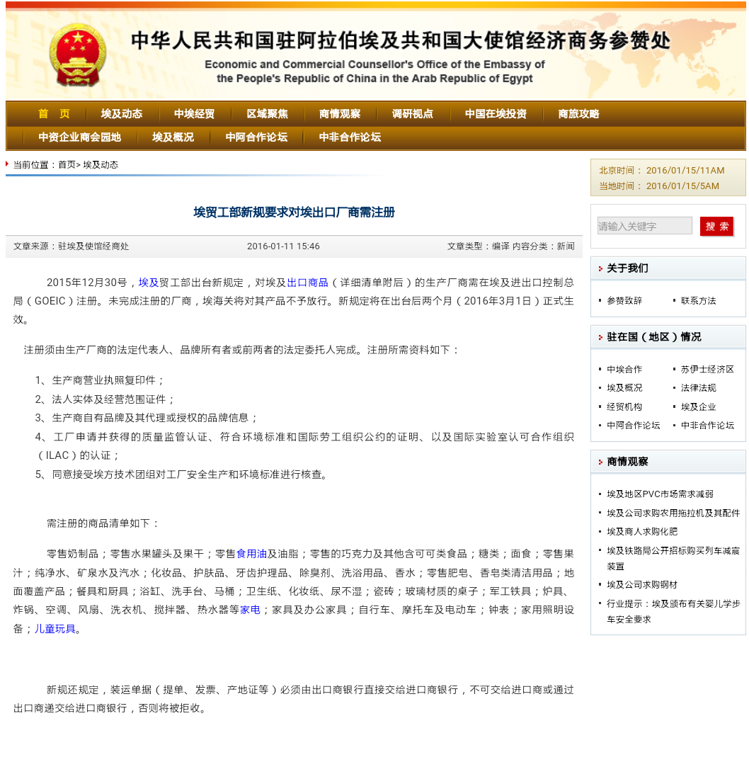 2015年12月30號(hào),埃及貿(mào)工部出臺(tái)新規(guī)定,對(duì)埃及出口商品(詳細(xì)清單附后)的生產(chǎn)廠商需在埃及進(jìn)出口控制總局(GOEIC)注冊(cè)。未完成注冊(cè)的廠商,埃海關(guān)將對(duì)其產(chǎn)品不予放行。新規(guī)定將在出臺(tái)后兩個(gè)月(2016年3月1日)正式生效。