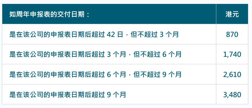 如逾期提交周年申報(bào)表,有限公司須繳付大幅度提高的注冊(cè)費(fèi)用(幅度由港幣870元至港幣3,480元)。