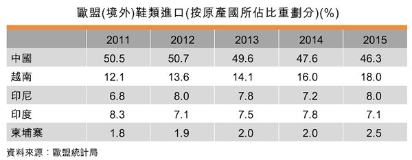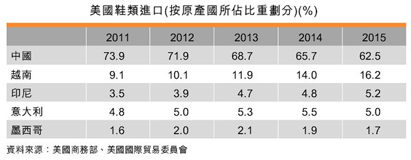 鞋類(lèi)方面,中國(guó)仍占美國(guó)進(jìn)口的大部分,不過(guò)所占比重已從2011年的73.9%下降到62.5%。歐盟境外進(jìn)口鞋類(lèi)方面,中國(guó)所占的比重從2011年的50.5%下降到2015年的46.3%。此外,越南及印尼均是美國(guó)及歐盟主要的進(jìn)口鞋類(lèi)供應(yīng)國(guó)。