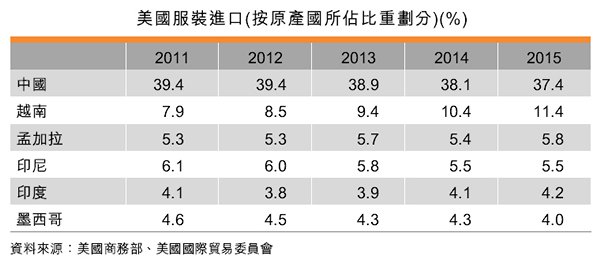 從中國(guó)在全球出口市場(chǎng)所占的比重可見(jiàn)中國(guó)整體出口仍保持競(jìng)爭(zhēng)力。不過(guò),部分生產(chǎn)活動(dòng)從中國(guó)分散至其它生產(chǎn)基地,特別是亞洲其他經(jīng)濟(jì)體,難免影響中國(guó)勞動(dòng)密集型或較低增值產(chǎn)品在海外市場(chǎng)所占的比重。服裝方面,中國(guó)占美國(guó)進(jìn)口的比重由2011年的39.4%降至2015年的37.4%,而越南則是新晉的供應(yīng)國(guó)。歐盟進(jìn)口服裝方面,中國(guó)所占的市場(chǎng)比重也從2011年的44%下降到2015年的37.5%。