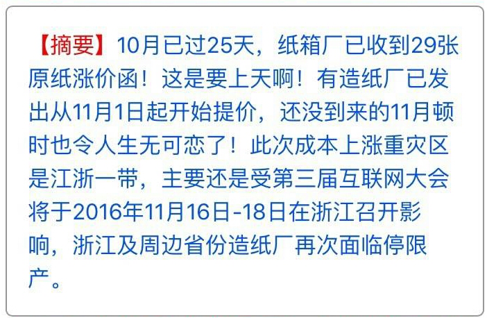 再回到2016年的這場(chǎng)漲價(jià)風(fēng)波,看來有了上次經(jīng)驗(yàn),浙江紙箱廠大多已從容應(yīng)對(duì),紛紛抱團(tuán)發(fā)出漲價(jià)函,除此之外,再結(jié)合市場(chǎng)其他形勢(shì),小編總結(jié)出如下較為全面的分析:
