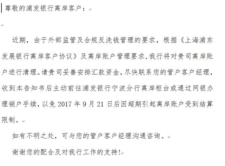 浦發(fā)銀行離岸賬戶通知