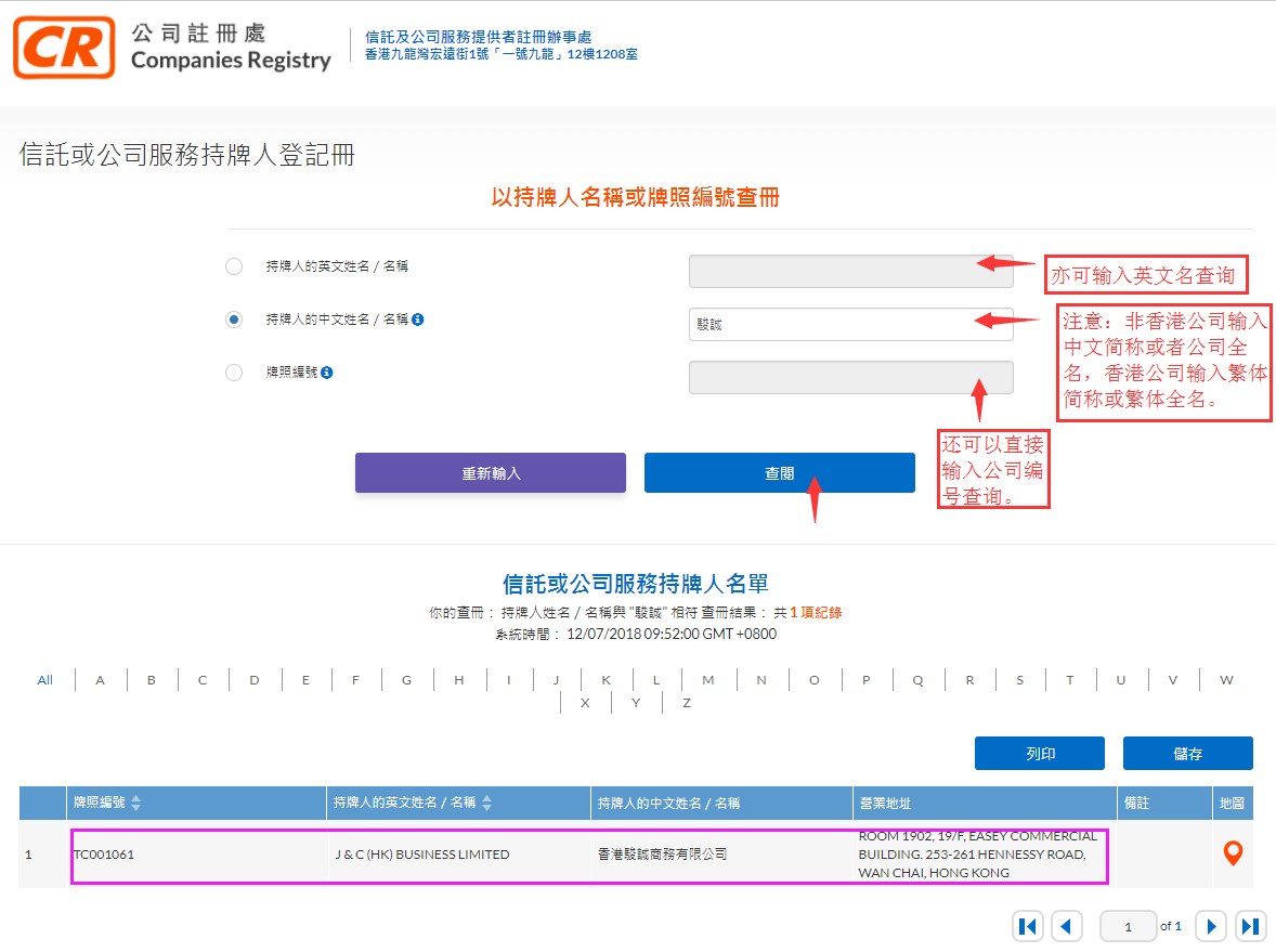 如按以上操作未查詢到結(jié)果,則該代理未辦理信托或公司服務(wù)持牌人牌照,或者牌照未下發(fā)。