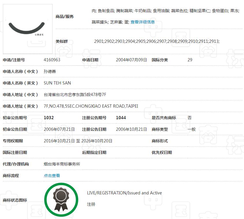 例如成語“心滿意足”注冊(cè)在第44類,指定商品\服務(wù)為“按摩; 保健; 公共衛(wèi)生浴; 理發(fā)店; 美容師服務(wù); 美容院; 桑拿浴服務(wù); 心理專家; 蒸氣浴;”等類別上的時(shí)候,被駁回了。但是當(dāng)注冊(cè)29類,指定使用在“肉; 魚制食品; 腌制蔬菜; 牛奶制品; 食用油脂; 蔬菜色拉; 精制堅(jiān)果仁; 食物蛋白; 果凍; 蔬菜罐頭; 芝麻醬; 蛋; ”時(shí),則被成功注冊(cè)。