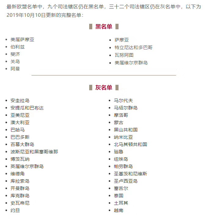 10月5日,歐盟公布了2021年的第二份“稅務不合作司法管轄區(qū)名單”(EU list of non-cooperative jurisdictions for tax purposes,即“黑名單”),宣布將安圭拉、多米尼加和塞舌爾從歐盟不合作名單中刪除。 答