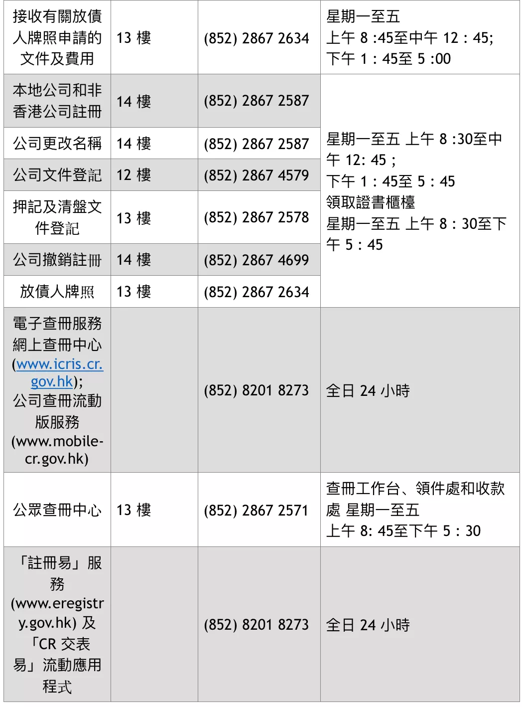 柜臺服務(wù)由5月4日起恢復(fù)正常辦公時(shí)間正常辦公時(shí)間的詳情如下:公司注冊處(金鐘道政府合署)