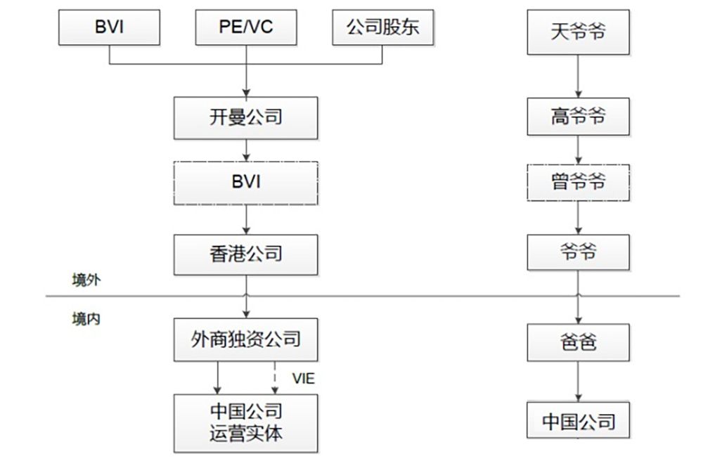 那讓咱們來仔細梳理梳理紅籌上市過程中這些洋祖宗公司和它們各自的作用。紅籌上市一般的架構(gòu)為BVI公司(可以有,天爺爺)+開曼公司(作為上市實體,必須有,高爺爺)+BVI公司(可以有,非必須,曾爺爺)+香港公司(爺爺)+外商獨資企業(yè)(Wholly Owned Foreign Enterprise,“WOFE”,爸爸)+境內(nèi)運營實體(中國公司)。