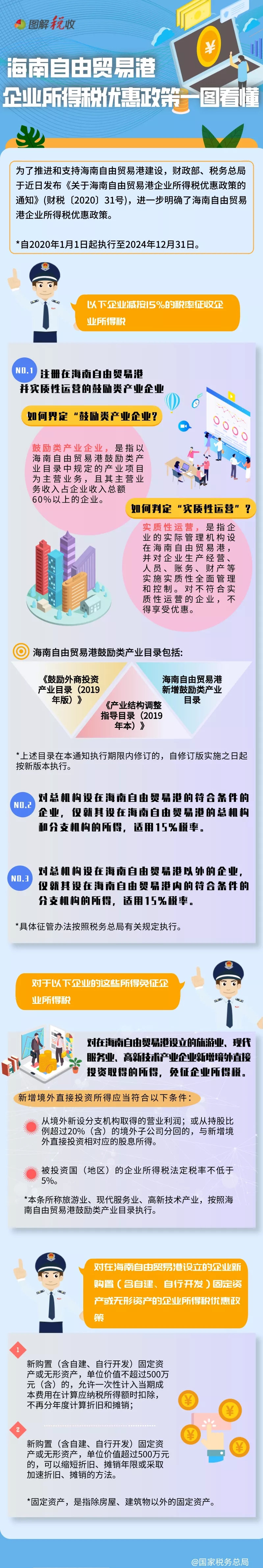 參考 關于海南自由貿易港企業(yè)所得稅優(yōu)惠政策的通知 財稅〔2020〕31號 海南省財政廳,國家稅務總局海南省稅務局: 為支持海南自由貿易港建設,現(xiàn)就有關企業(yè)所得稅優(yōu)惠政策通知如下: 一、對注冊在海南自由貿易港并實質性運營的鼓勵類產業(yè)企業(yè),減按15%的稅率征答