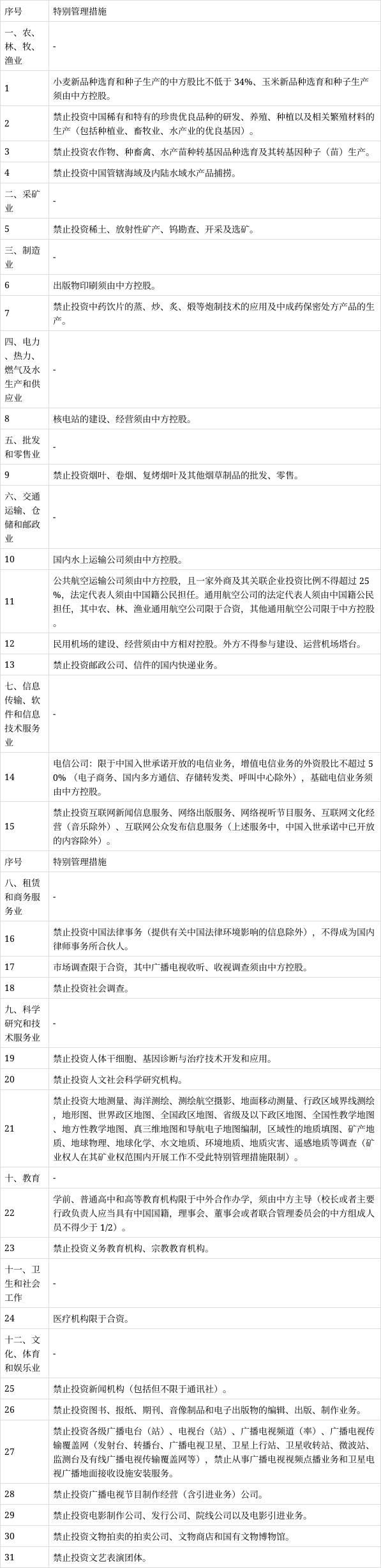 《外商投資準入特別管理措施(負面清單)》(以下簡稱《外商投資準入負面清單》)統一列出股權要求、高管要求等外商投資準入方面的特別管理措施。《外商投資準入負面清單》之外的領域,按照內外資一致原則實施管理。境內外投資者統一適用《市場準入負面清單》的有關規(guī)定。
