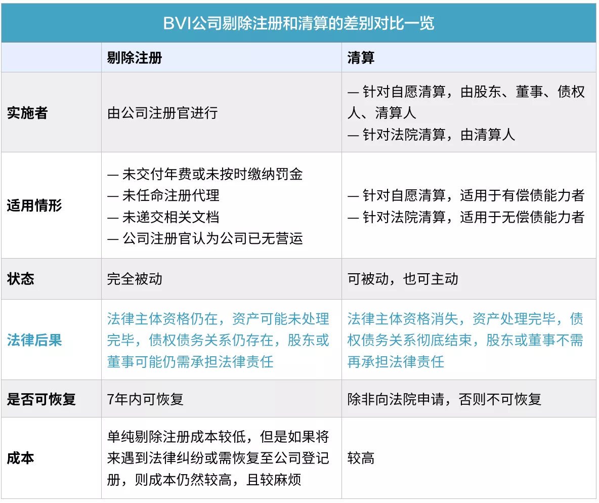 ? 由此可見,在解散一家BVI公司時,需要慎重考慮選擇“剔除注冊”還是“清算”,二者法律責任不同,法律風險更是迥異。相對而言,剔除注冊的法律風險更高。