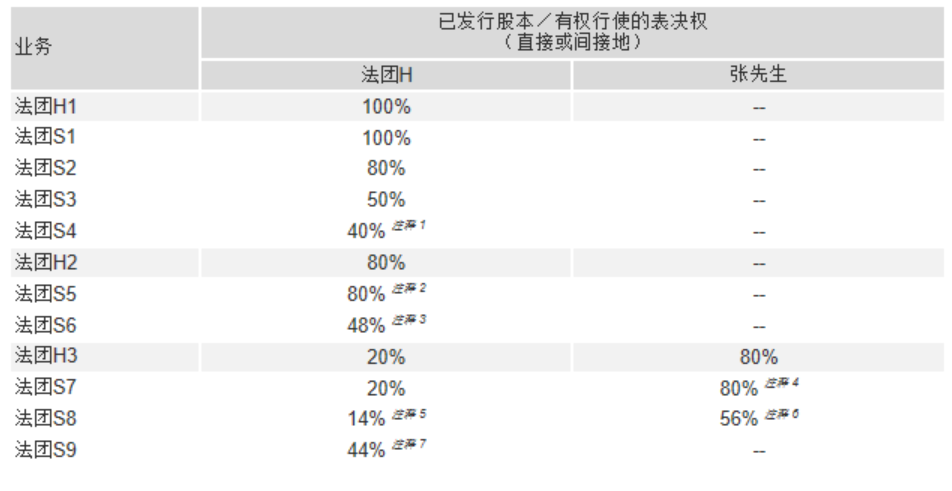 (7)法團(tuán)H擁有或控制法團(tuán)S9合計(jì)44%的已發(fā)行股本╱有權(quán)行使或支配行使法團(tuán)S9合計(jì)44%的表決權(quán)(即100% × 80% × 55%)。
