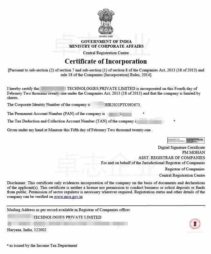 6、申請(qǐng)公司設(shè)立認(rèn)證后材料提交申請(qǐng)獲得批準(zhǔn)后,將獲得公司注冊(cè)證書(shū),之后再申請(qǐng)獲得永久賬號(hào)PAN卡,稅務(wù)賬號(hào)TAN碼。