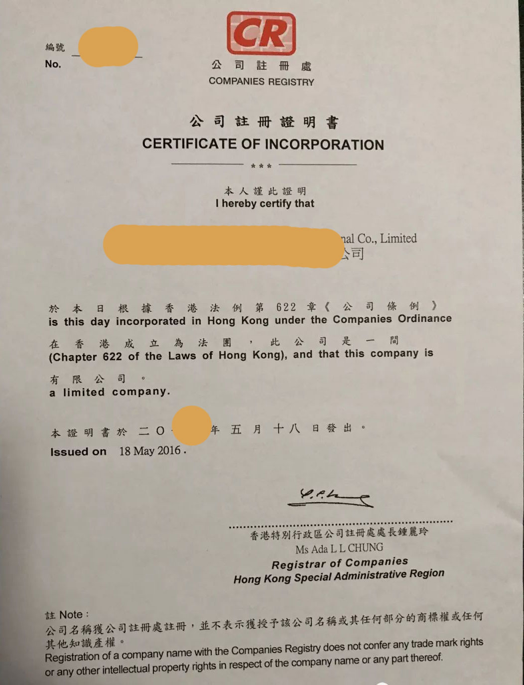 通常成立香港公司后所得到的全套資料如下: 1、商業(yè)登記證(BUSINESS REGISTRATION CERTIFICATE) 2、注冊證書(CERTIFICATE OF INCORPRATION) 3、法團(tuán)成立表格NNC1 4、一套章程 5、鋼印一枚、條形答