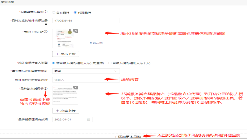 若商標非開店公司自有,品牌類型請選擇代理品牌,并按照以下要求上傳資料: