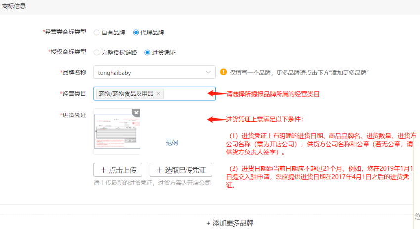 經(jīng)營類商標需至少上傳1個,點擊“添加更多品牌”進行添加。