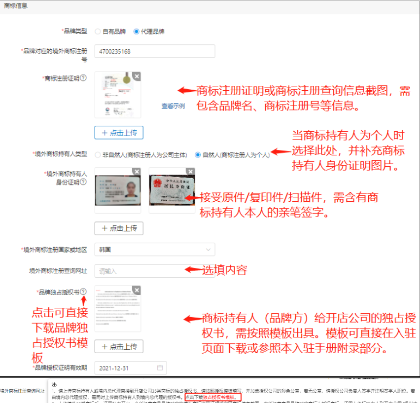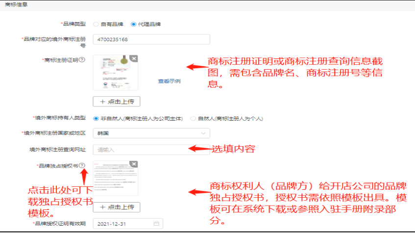(1)需上傳境外商標注冊證明或商標信息查詢截圖,以及商標持有人(品牌方)或總代理到開店公司的獨占授權(quán)書,授權(quán)書需按照入駐頁面或本入駐手冊附錄的模板出具。若由總代理授權(quán),需同時上傳品牌方到總代理的授權(quán)書。