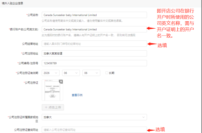 請上傳開店公司(要求是境外公司)的公司注冊證明,接受原件、復(fù)印件或掃描件,并請如實填寫開店公司信息,帶“*”為必填內(nèi)容,“公司注冊證查詢網(wǎng)址”和“公司經(jīng)營地址”為選填內(nèi)容。其中銀行賬戶名處需填寫開店公司在銀行開戶時所使用的公司英文名稱,需與開店公司的開戶證明上的開戶名一致。
