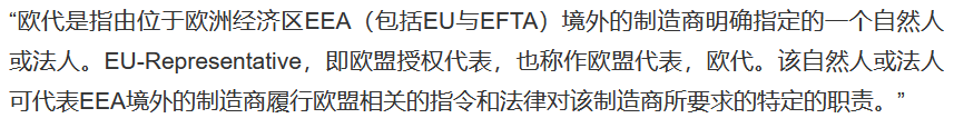 歐盟授權(quán)代表是指由位于歐洲經(jīng)濟區(qū)EEA境外的制造商明確指定的一個自然人或法人。該自然人或法人可代表EEA境外的制造商履行歐盟相關(guān)的指令和法律對該制造商所要求的特定的職責(zé)。
