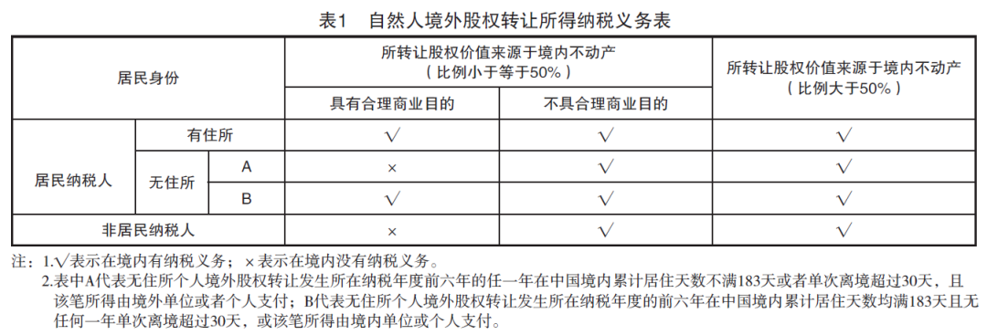 作為非居民,其僅就來(lái)源于中國(guó)境內(nèi)的所得申報(bào)繳納個(gè)人所得稅。境外股權(quán)轉(zhuǎn)讓所得在大多數(shù)情況下被認(rèn)定為來(lái)源中國(guó)境外的所得,在中國(guó)免予繳納個(gè)人所得稅,但有兩種情況除外:一是根據(jù)3號(hào)公告第一條第七款的規(guī)定,境外被轉(zhuǎn)讓股權(quán)公允價(jià)值50%以上直接或間接來(lái)自于位于中國(guó)的不動(dòng)產(chǎn),符合此條件的境外股權(quán)轉(zhuǎn)讓所得將被直接認(rèn)定為來(lái)源于中國(guó)境內(nèi)的所得,應(yīng)向中國(guó)稅務(wù)機(jī)關(guān)申報(bào)繳納個(gè)人所得稅;二是通過(guò)不具有合理商業(yè)目的安排獲取不當(dāng)稅收利益,被中國(guó)稅收機(jī)關(guān)進(jìn)行納稅調(diào)整。如《中華人民共和國(guó)政府和新加坡共和國(guó)政府關(guān)于對(duì)所得避免雙重征稅和防止偷漏稅的協(xié)定》在第十三條第五款中約定,一方居民轉(zhuǎn)讓締約國(guó)另一方居民公司股權(quán)行為發(fā)生前十二個(gè)月內(nèi)曾直接或間接參與該公司至少25%資本,可在該締約國(guó)另一方征稅。雖該轉(zhuǎn)讓行為一般是指非居民納稅人直接轉(zhuǎn)讓中國(guó)公司股權(quán),但如果其通過(guò)不具有合理商業(yè)目的的安排間接轉(zhuǎn)讓中國(guó)公司股權(quán),則中國(guó)稅務(wù)機(jī)關(guān)有權(quán)啟動(dòng)反避稅調(diào)查程序,進(jìn)行反避稅調(diào)查。經(jīng)歸納,自然人境外股權(quán)轉(zhuǎn)讓所得納稅義務(wù)詳見(jiàn)表1。