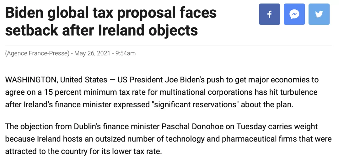 只是時(shí)移世易,曾經(jīng)的12.5%即將被15%所取代,那么,愛(ài)爾蘭在接下來(lái)的15%最低全球稅率體系中就只能“悲劇”了。正因?yàn)槿绱耍谝槐姳芏愄焯弥?,?ài)爾蘭不顧一切地站了出來(lái),直接對(duì)新的最低稅率表示反對(duì)。