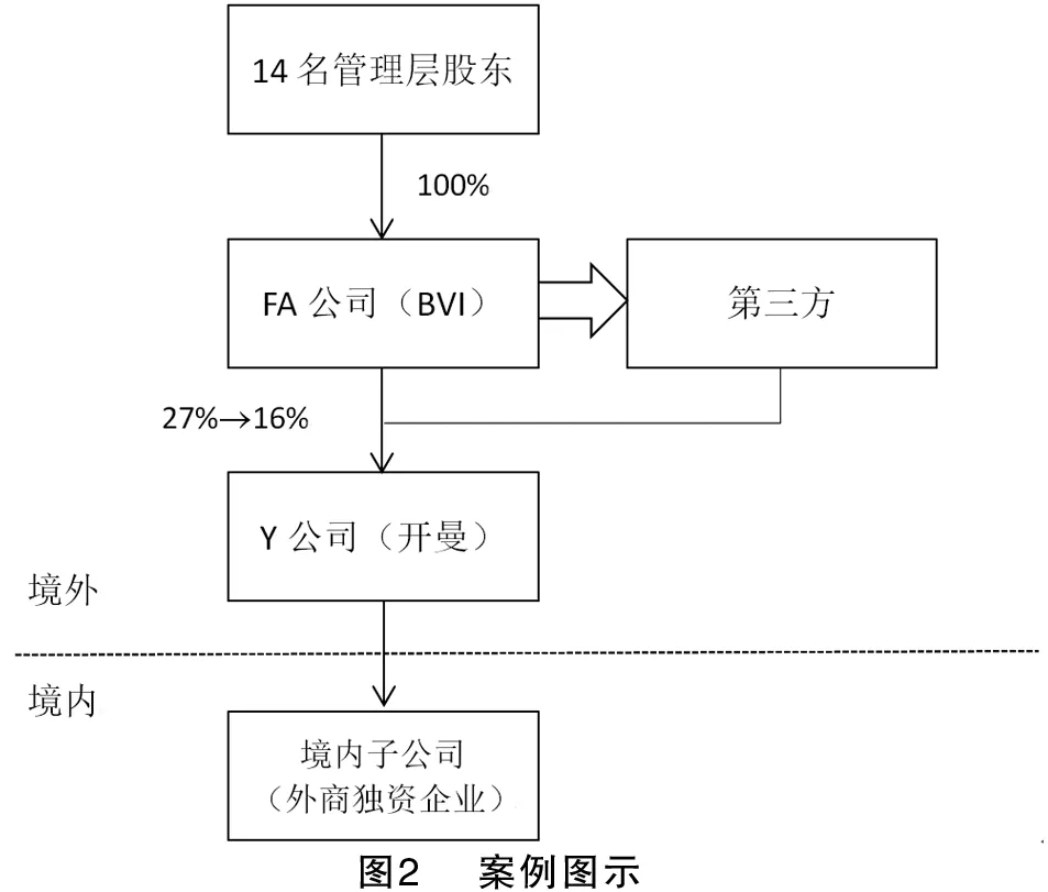 2009年-2010年,14名中國居民個人通過控制(100%持股)注冊在英屬維爾京群島(BVI)市的FA公司,先后兩次總共減持其于開曼群島上市的Y公司(采用紅籌模式上市的境外注冊公司)12200萬股股份(分別為6500萬股、5700萬股),使得FA公司對Y公司持股比例由27%減至16%,總計轉(zhuǎn)讓獲利逾18億港元(交易結(jié)構(gòu)如圖2所示)。