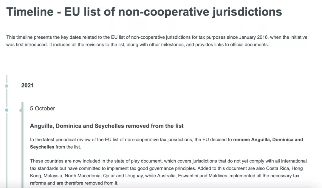10月5日,歐盟公布了2021年的第二份“稅務(wù)不合作司法管轄區(qū)名單”(EU list of non-cooperative jurisdictions for tax purposes,即“黑名單”),宣布將安圭拉、多米尼加和塞舌爾從歐盟不合作名單中刪除。
