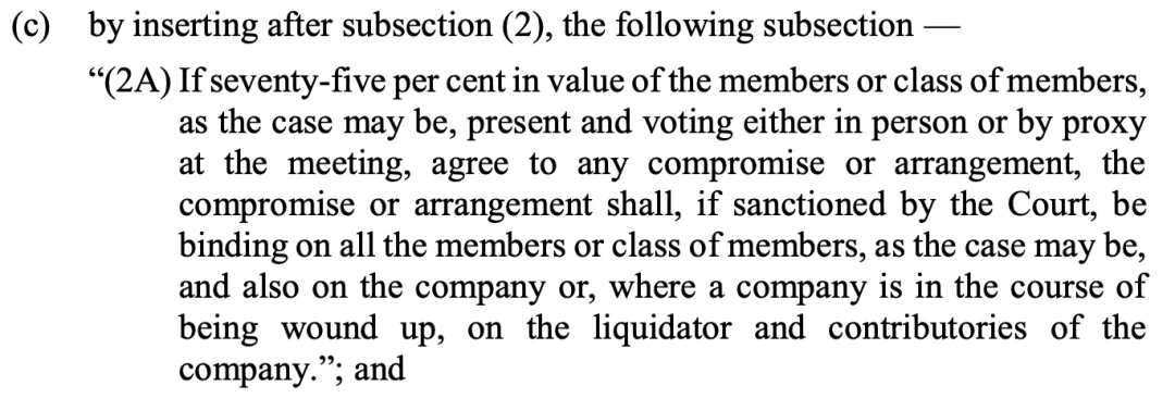 《公司法》(2021年修訂)新增的第86(2A)條將適用于股東協(xié)議,其規(guī)定:“若持有股份面值不少于75%的股東或類別股東(視情況而定)親自(或委派代表)出席會(huì)議并投票贊成任何和解或安排,則該和解或安排一經(jīng)法院批準(zhǔn),即對(duì)所有股東或類別股東(視情況而定)具有約束力,且亦對(duì)公司(倘公司正在進(jìn)行清盤,則對(duì)清盤人和出資人)具有約束力?!?br />