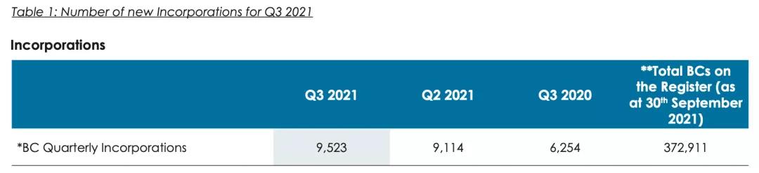 統(tǒng)計(jì)數(shù)據(jù)顯示,僅就最常見(jiàn)的BCs而言,其在第三季度的注冊(cè)數(shù)量為:9523家,同比2020年第三季度的6254家增幅高達(dá)近35%;即便與今年第二季度的9114家相比,仍然保持了4.49%的增長(zhǎng)態(tài)勢(shì)。