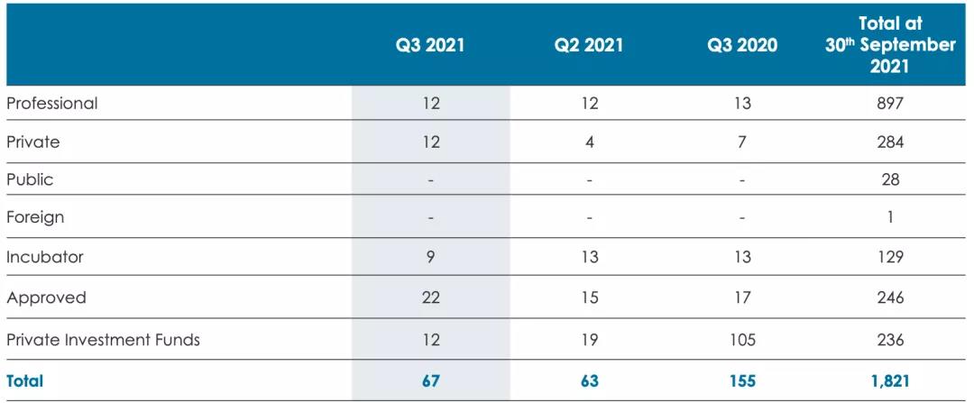 在第三季度,于BVI設(shè)立的各類基金總數(shù)為67家,同比2020年第三季度的155家有“斷崖式下降”,詳情如下表: