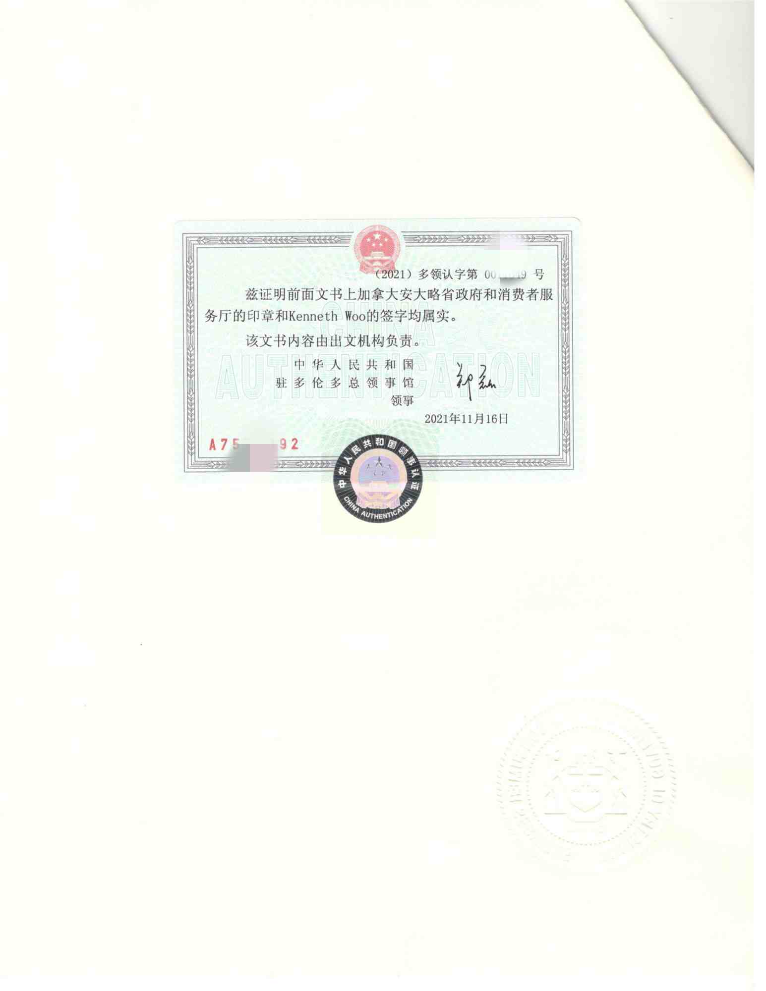 送由中國駐加拿大多倫多使領(lǐng)館進(jìn)行認(rèn)證。