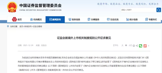 12月24日,中國(guó)證監(jiān)會(huì)發(fā)布了《國(guó)務(wù)院關(guān)于境內(nèi)企業(yè)境外發(fā)行證券和上市的管理規(guī)定(草案征求意見稿)》(以下簡(jiǎn)稱《管理規(guī)定》)和《境內(nèi)企業(yè)境外發(fā)行證券和上市備案管理辦法(征求意見稿)》(以下簡(jiǎn)稱《備案辦法》)【1】,明確VIE架構(gòu)企業(yè)在合法合規(guī)并完成備案的前提下可以申請(qǐng)境外上市。