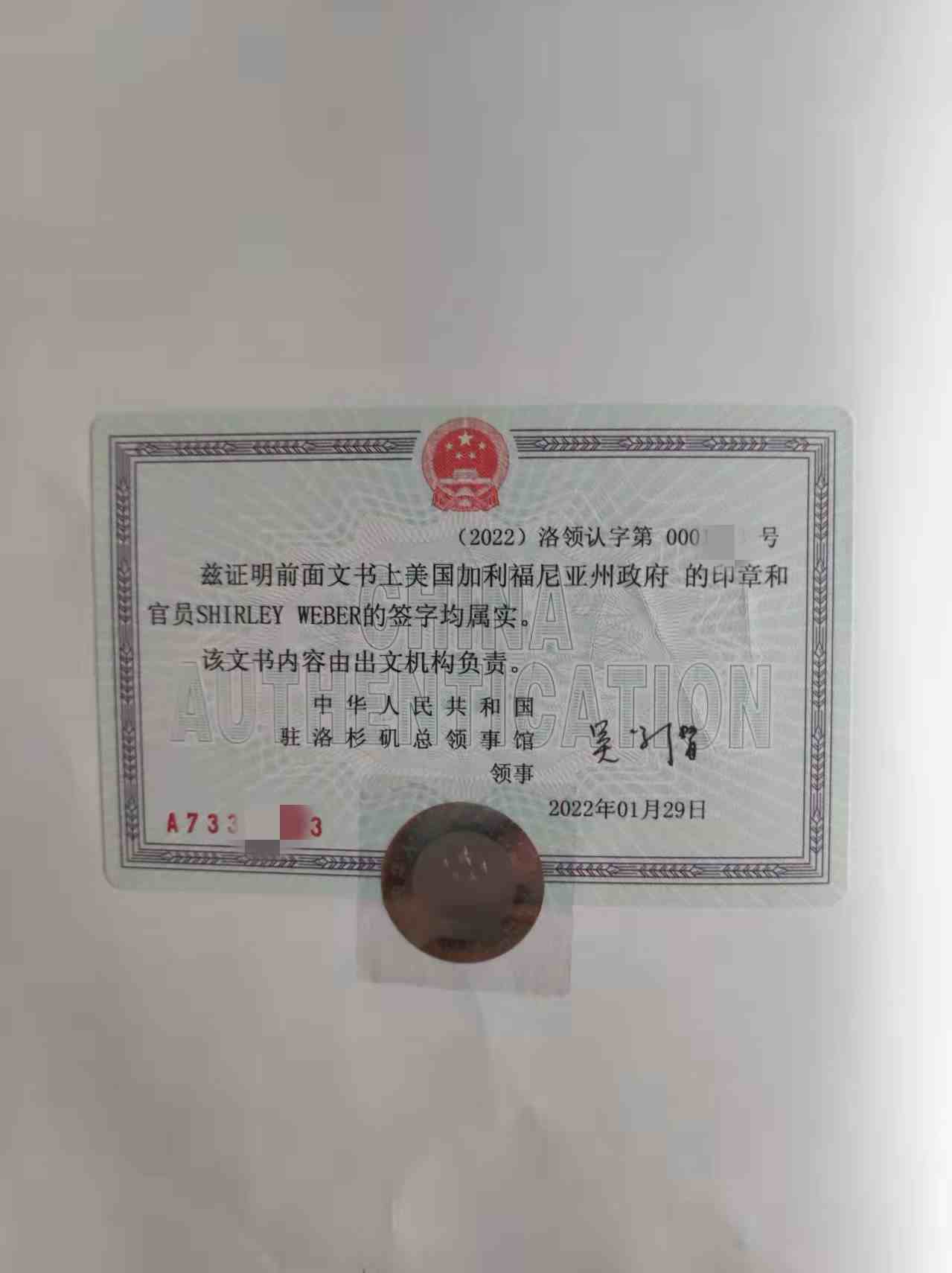 中國駐美國使館進行領(lǐng)事認證:只受理上兩級確認過之后的文件,不對文件內(nèi)容負責,只是確認文件上公證律師和州務(wù)卿官員的簽字或蓋章的真?zhèn)巍?br />